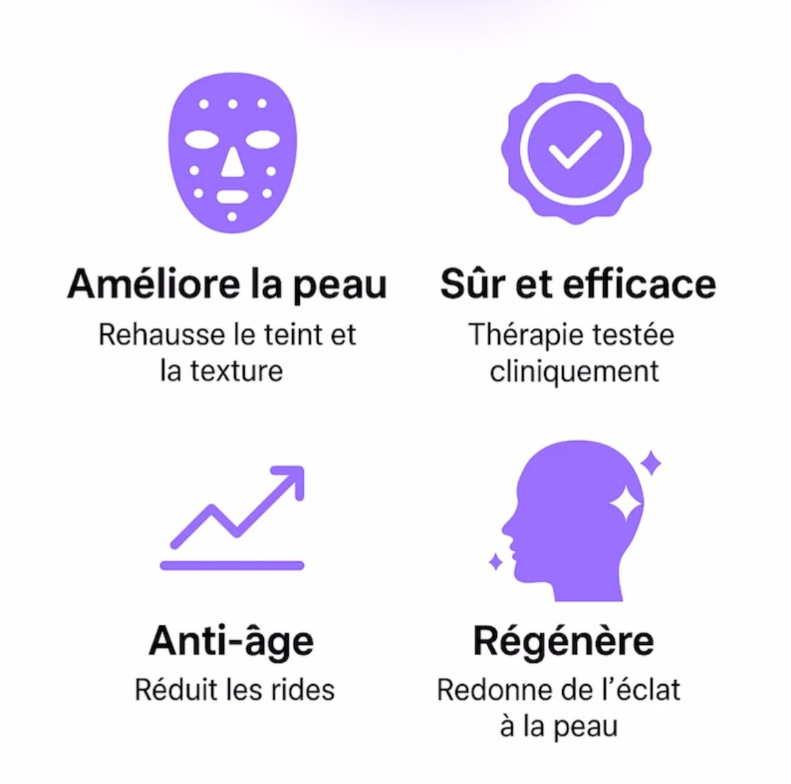 Depuis le confort de votre maison, profitez des bienfaits de la lumière LED pour éliminer tous les problèmes de peau tels que l'acné sévère, l'eczéma, le psoriasis, les pores dilatés, la peau terne, la couperose, la dermatite atopique, et bien plus encore.